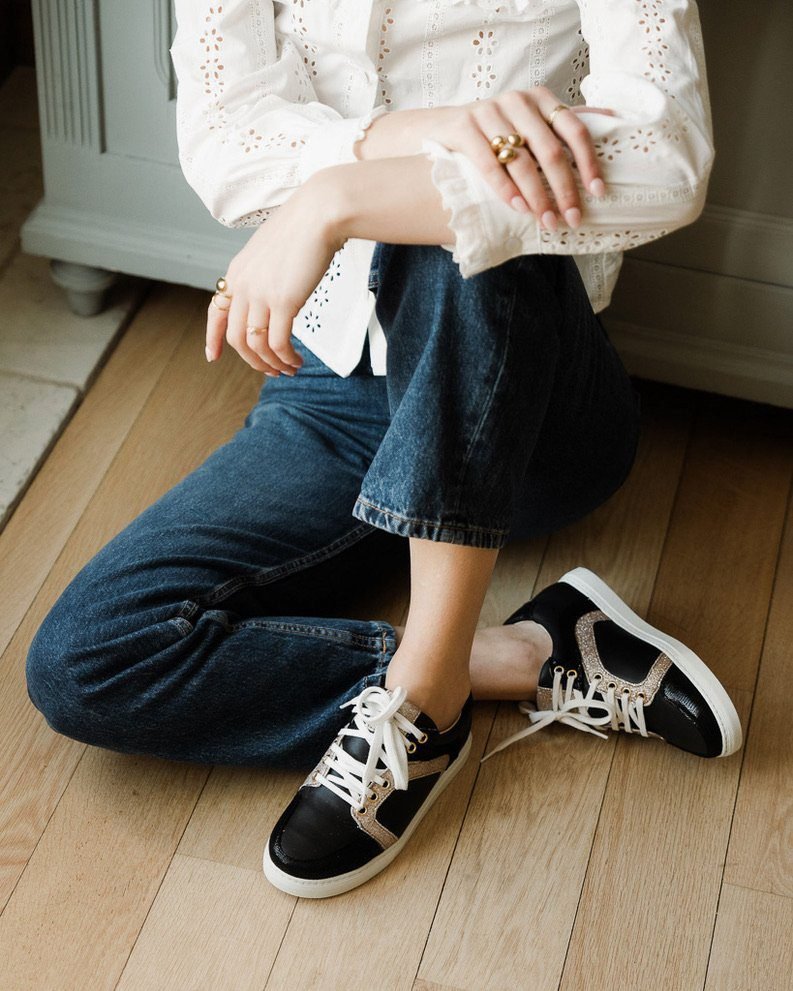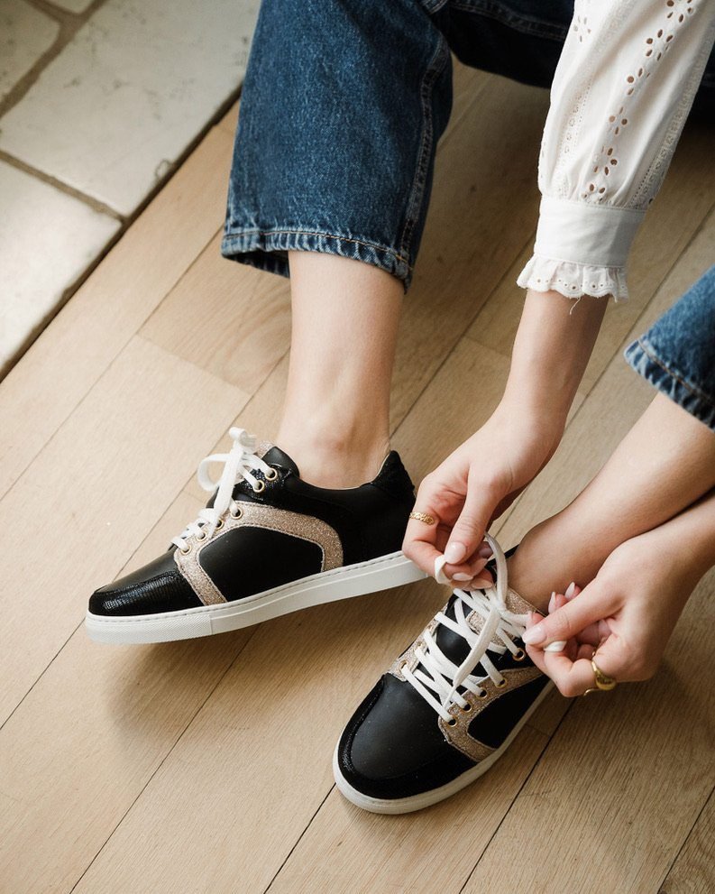 Oscar sneaker in smooth black leather, black viperine and fine champagne sequins.
