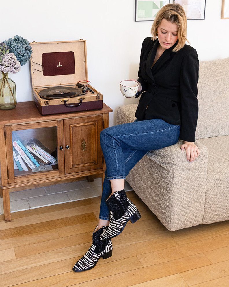 Santiag in black suede and zebra fur.