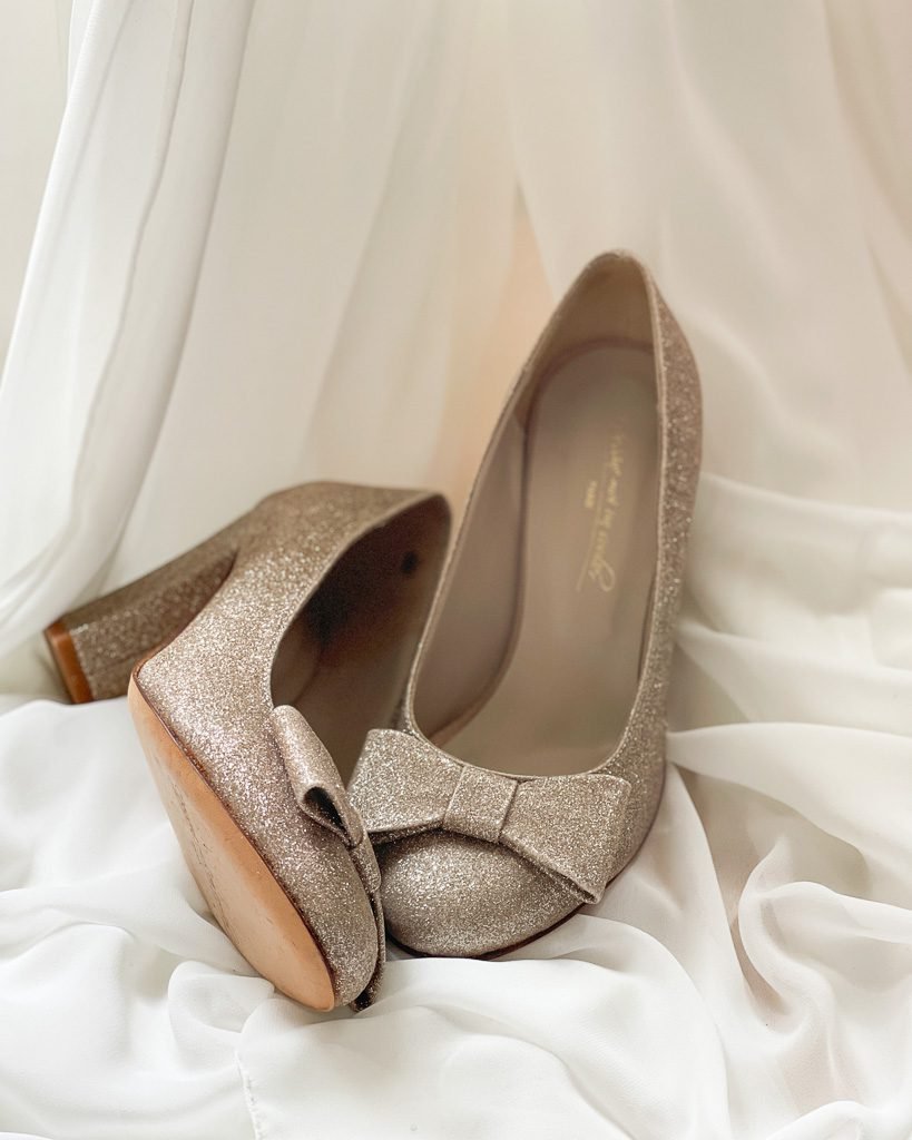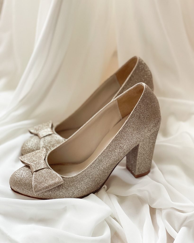 Round-toe slingback in fine blond gold sequins, 8cm chunky heel. Lisa bow in fine blond gold sequins.