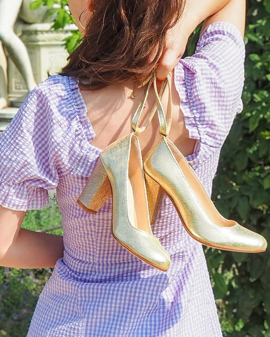 Iridescent leather pump with fine champagne sequins, 8 cm chunky heel.