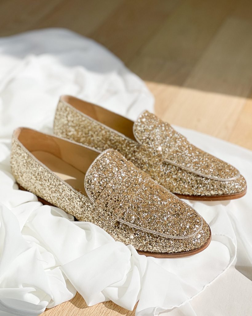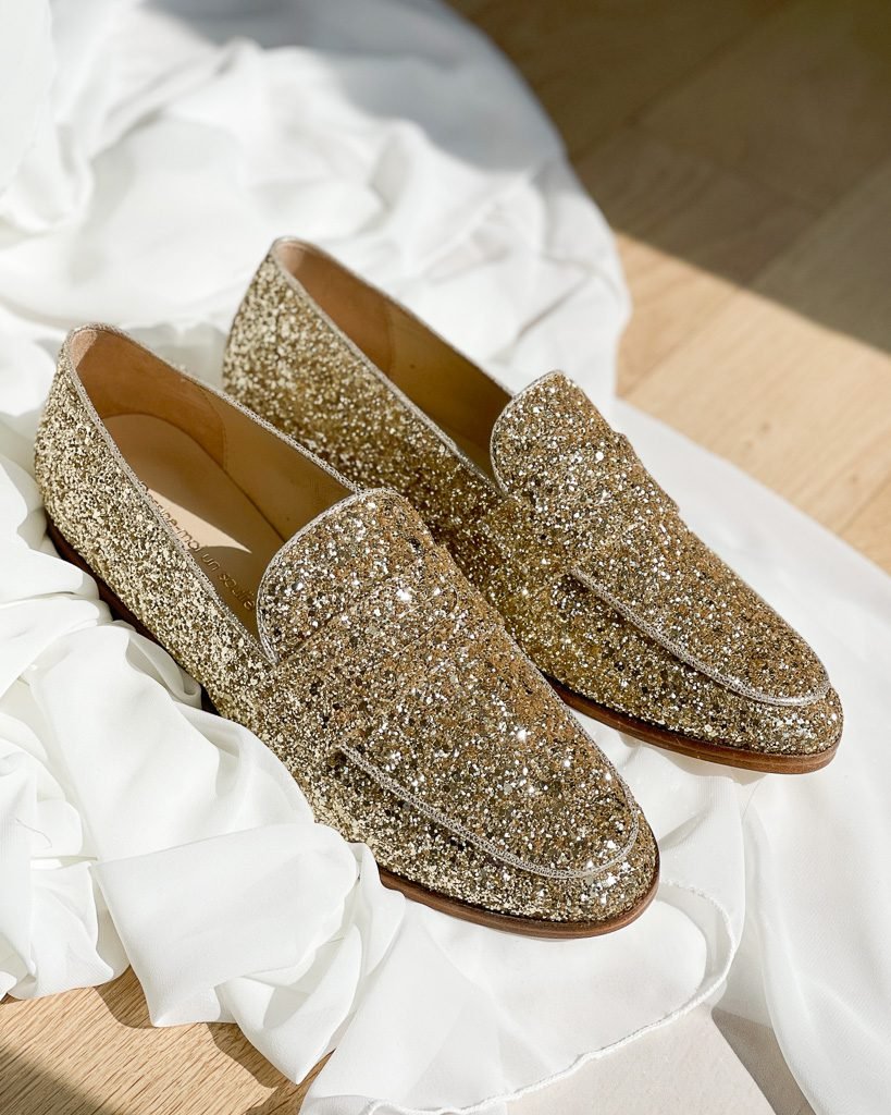 Notre modèle de mocassin en glitter doré vous permet d’allier confort et élégance, et de vous créer un modèle de cérémonie sans talon.