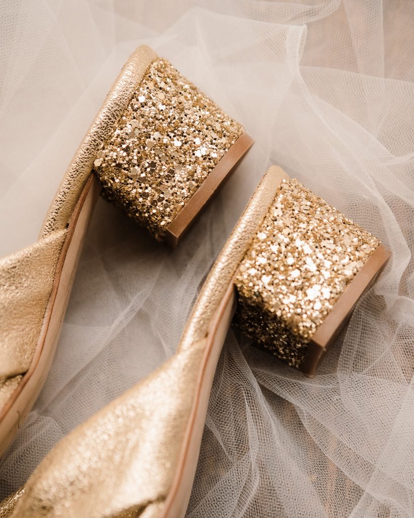 Mule pour mariée à petit talon de 4 cm. Sandale de couleur champagne, elle est composée de cuir irisé et de glitter doré. La sandale incontournable pour les mariées qui n’ont pas l’habitude de porter des talons.