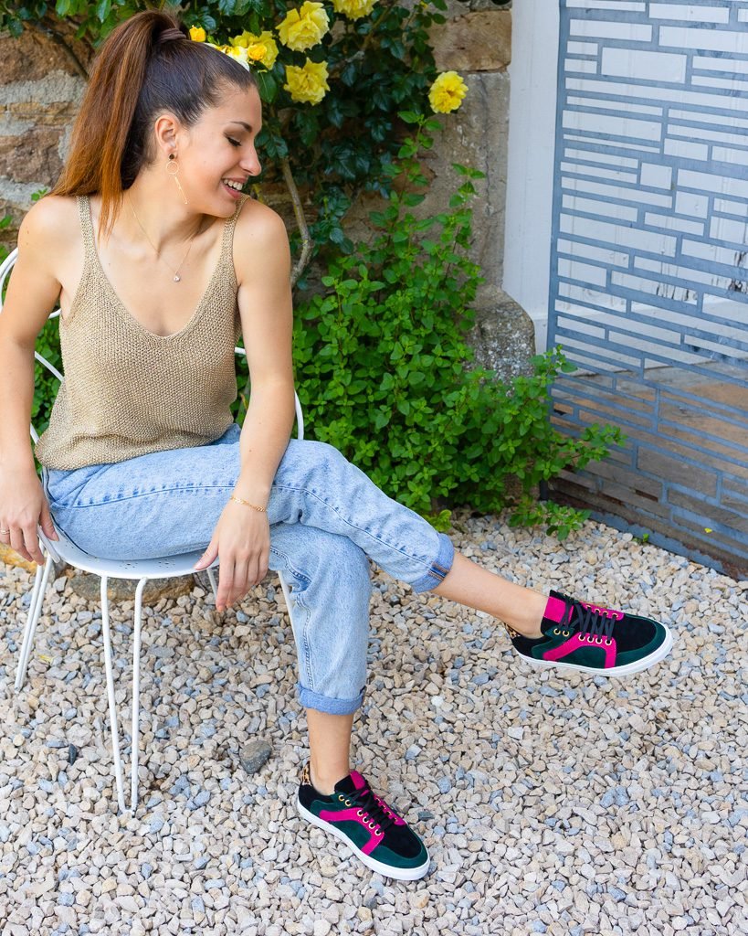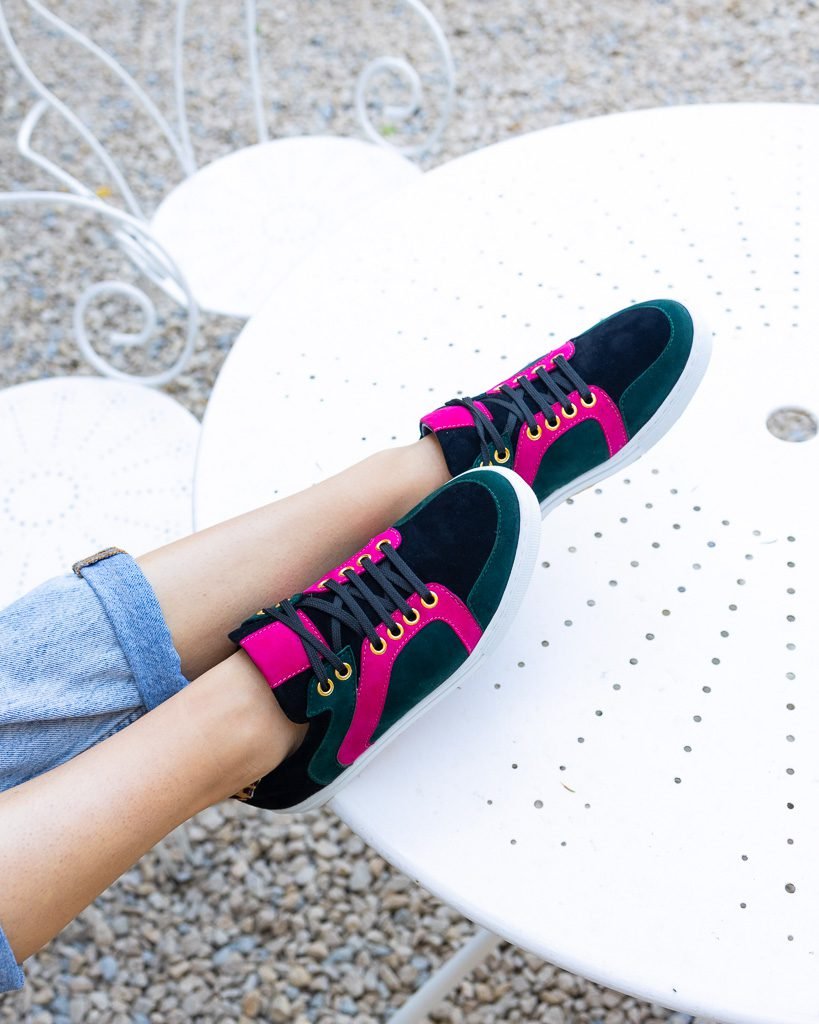 Baskets Oscar en velours noir, vert sapin et rose vif
