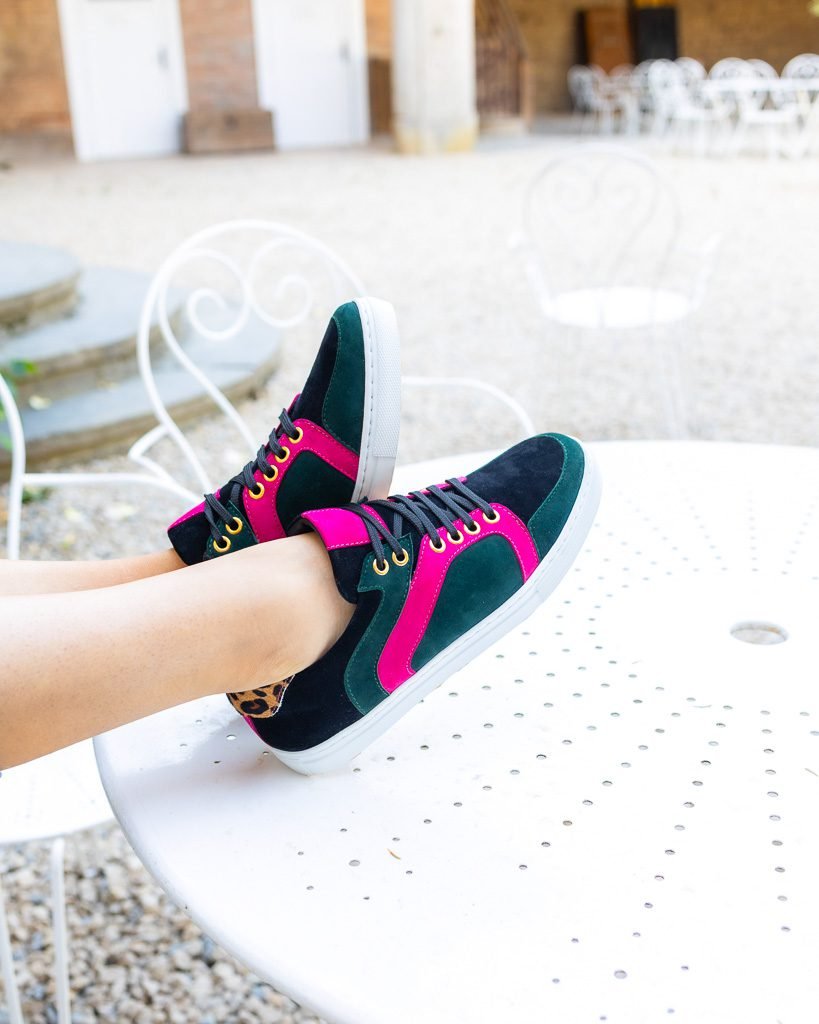 Baskets Oscar en velours noir, vert sapin et rose vif, détail en poil léopard.