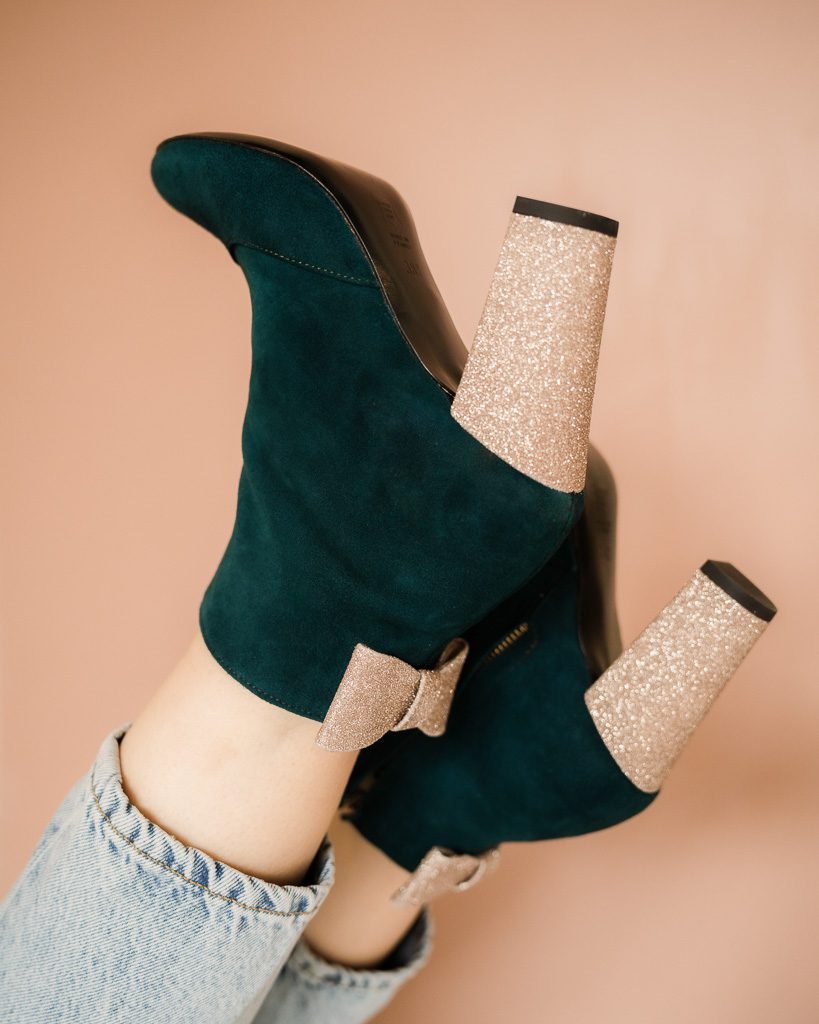 Bottine à talon en velours vert sapin et fine paillette or blond.