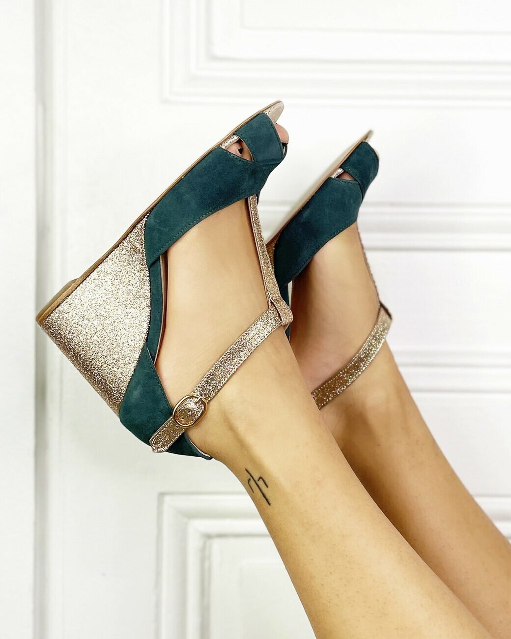 Salomé brides croisées avec talon compensé en velours vert eucalyptus et fines paillettes champagne. Talon compensé de 8 cm.