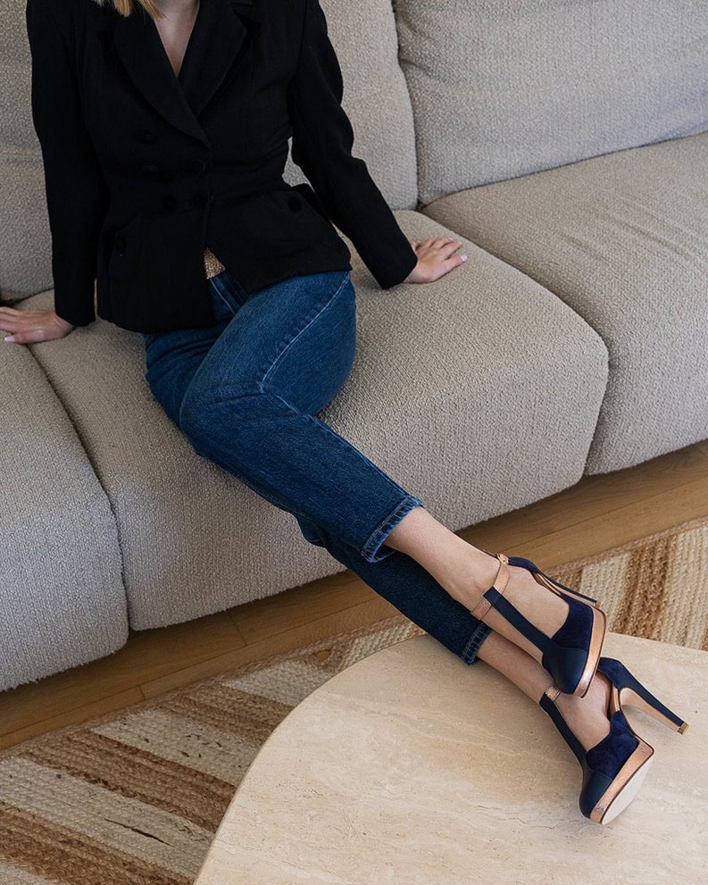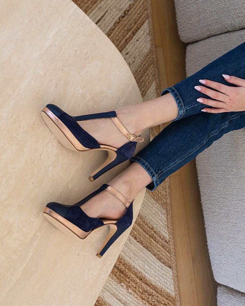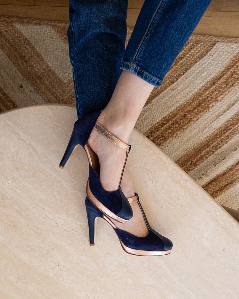 Salomé fermé à plateforme en cuirs velours marien, cuirs lisse marine et irisés or rose.