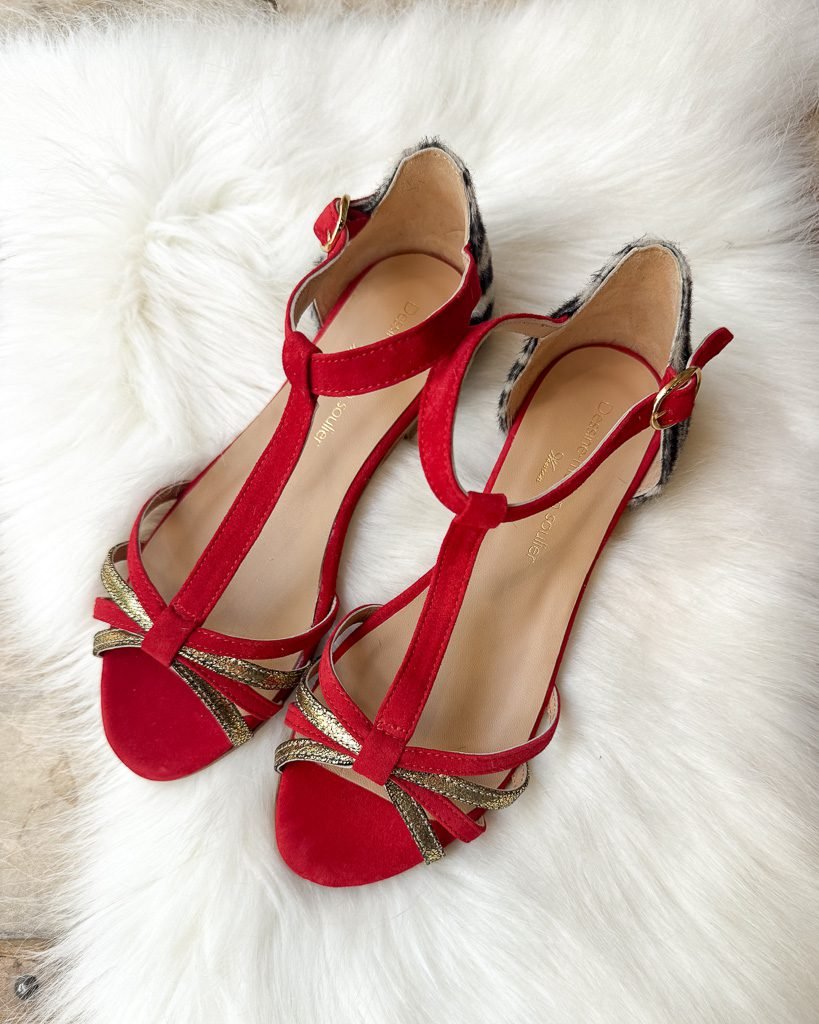 Sandale Chloé en irisé bronze velours rouge et zèbre.